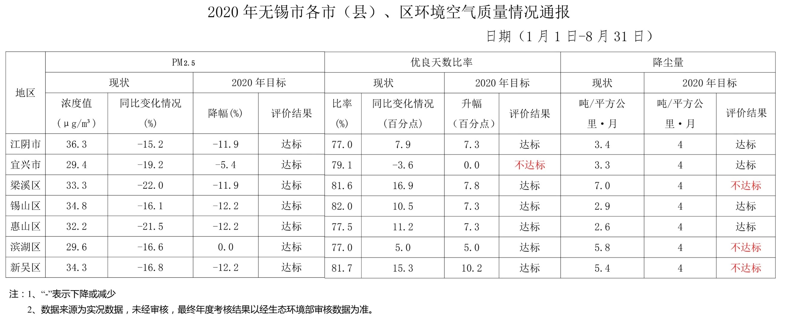 通报显示2020年1月1日—8月31日,PM2.5浓度所有地区均比去年同期大幅下降,均达到市下达的目标任务,其中梁溪区降幅最大,江阴市绝对值全市最高;优良天数比率除宜兴市外所有地区均比上年同期上升并达到市下达的目标任务,其中梁溪区同比增长幅度最大,宜兴市同比不增反降。降尘量梁溪区、滨湖区和新吴区未达标。