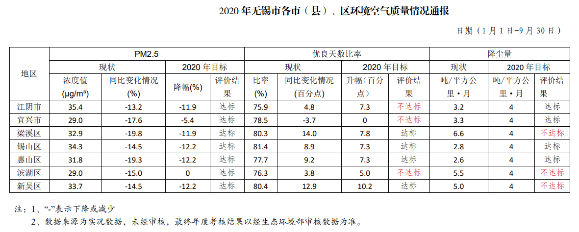 通报显示,2020年1月1日—9月30日,所有地区PM2.5浓度均比去年同期大幅下降,均达到市下达的目标任务,其中梁溪区降幅最大,江阴市绝对值全市最高;优良天数比率除宜兴市外所有地区均比上年同期上升,梁溪区、锡山区、惠山区、新吴区达到市下达的目标任务,其中梁溪区同比增长幅度最大,宜兴市同比不增反降。降尘量梁溪区、滨湖区和新吴区未达标。