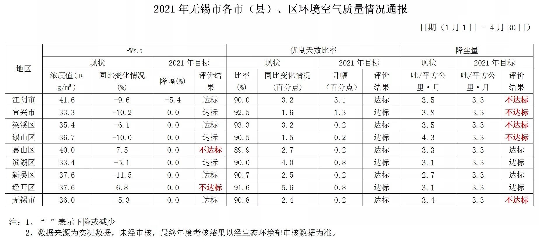 通报显示2021年1月1日—4月30日,PM2.5浓度除惠山区、经开区外均比去年同期大幅下降,达到市下达的目标任务,其中江阴市绝对值全市最高,惠山区升幅最大,宜兴市绝对值全市最低,新吴区降幅最大;优良天数比率均达到市下达的目标任务,其中惠山区绝对值全市最低,锡山区升幅最小,梁溪区绝对值全市最高,经开区升幅最大。降尘量惠山区、滨湖区、新吴区和经开区达标。