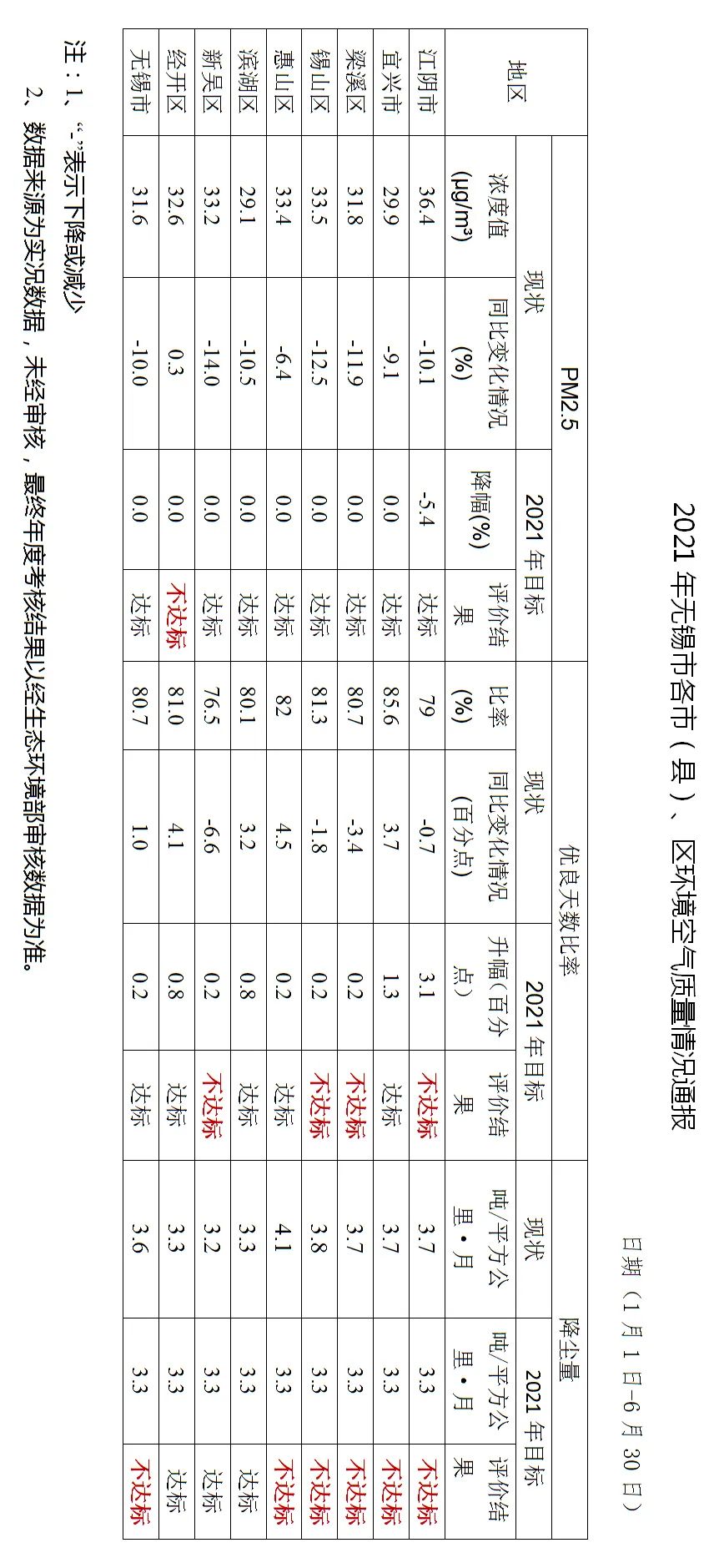 通报显示2021年1月1日—6月30日,PM2.5浓度除经开区外均比去年同期大幅下降,达到市下达的目标任务,其中江阴市绝对值全市最高,经开区升幅最大,滨湖区绝对值全市最低,新吴区降幅最大;优良天数比率除江阴市、梁溪区、锡山区、新吴区外均达到市下达的目标任务,其中新吴区绝对值全市最低,降幅最大,宜兴市绝对值全市最高,惠山区升幅最大。降尘量滨湖区、新吴区和经开区达标。