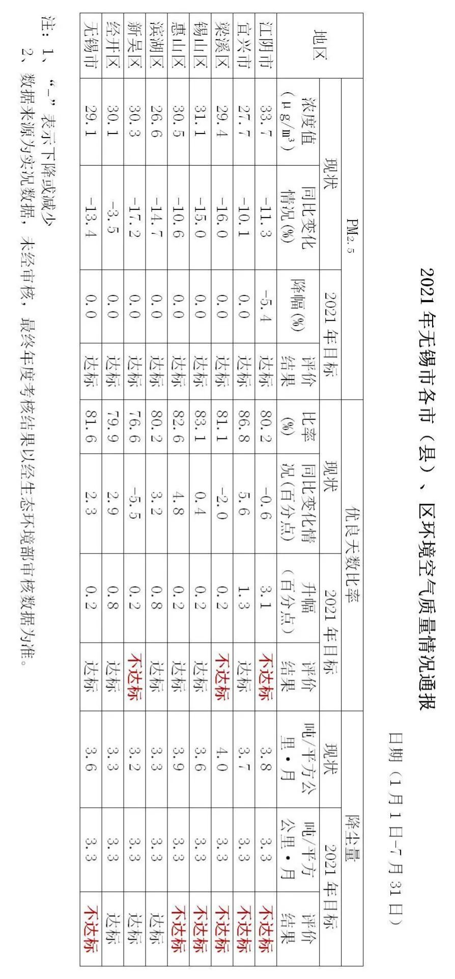 通报显示2021年1月1日—7月31日,全市PM2.5浓度均比去年同期大幅下降,达到市下达的目标任务,其中江阴市绝对值全市最高,经开区降幅最低,滨湖区绝对值全市最低,新吴区降幅最大;优良天数比率除江阴市、梁溪区、新吴区外均达到市下达的目标任务,其中新吴区绝对值全市最低,降幅最大,宜兴市绝对值全市最高,升幅最大。降尘量滨湖区、新吴区、经开区达标。