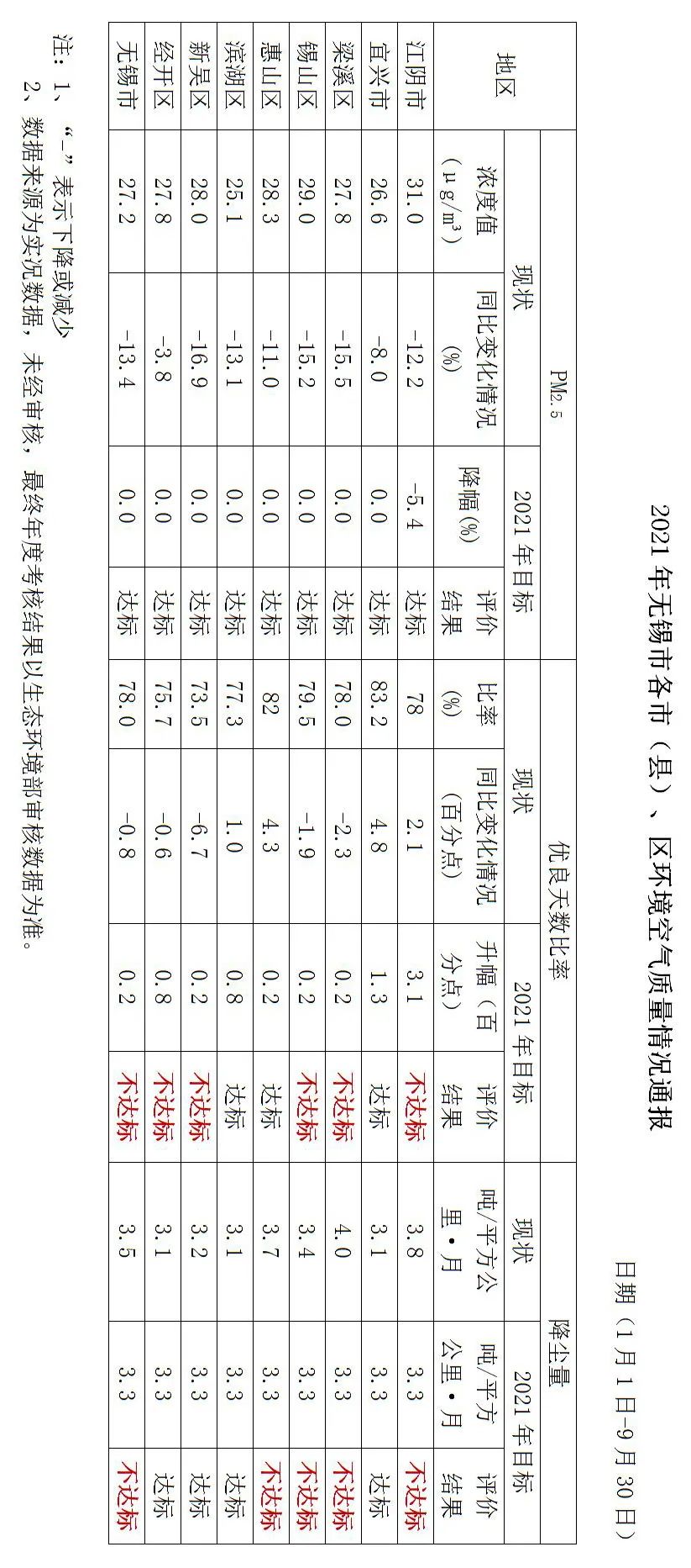 通报显示2021年1月1日—9月30日,全市PM2.5浓度均比去年同期大幅下降,达到市下达的目标任务,其中江阴市绝对值全市最高,经开区降幅最低,滨湖区绝对值全市最低,新吴区降幅最大;优良天数比率宜兴市、惠山区、滨湖区达到市下达的目标任务,其中新吴区绝对值全市最低,降幅最大,宜兴市绝对值全市最高,升幅最大。降尘量宜兴市、滨湖区、新吴区、经开区达标,其余未达标。