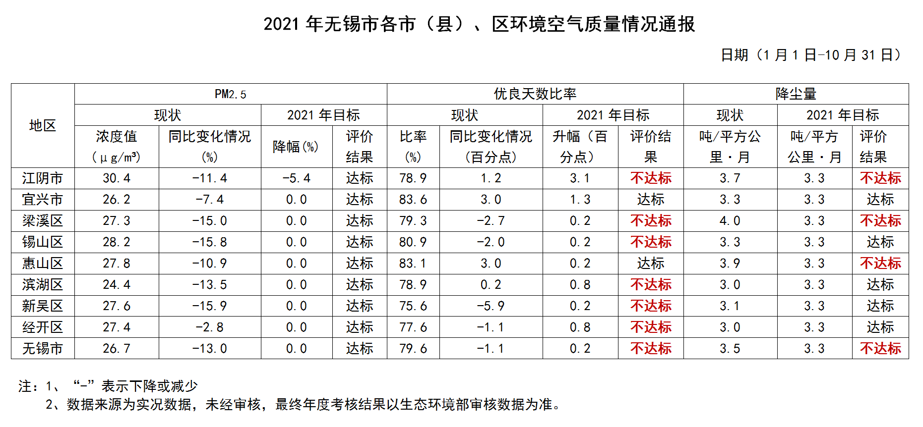 通报显示2021年1月1日—10月31日,全市PM2.5浓度均比去年同期大幅下降且达到市下达的目标任务,其中滨湖区绝对值全市最低,新吴区降幅最大,江阴市绝对值全市最高,经开区降幅最低;优良天数比率宜兴市、惠山区达到市下达的目标任务,其中宜兴市绝对值全市最高,宜兴市、惠山区升幅最大(并列),新吴区绝对值全市最低且降幅最大;降尘量江阴市、梁溪区、惠山区未达到市下达的目标任务。