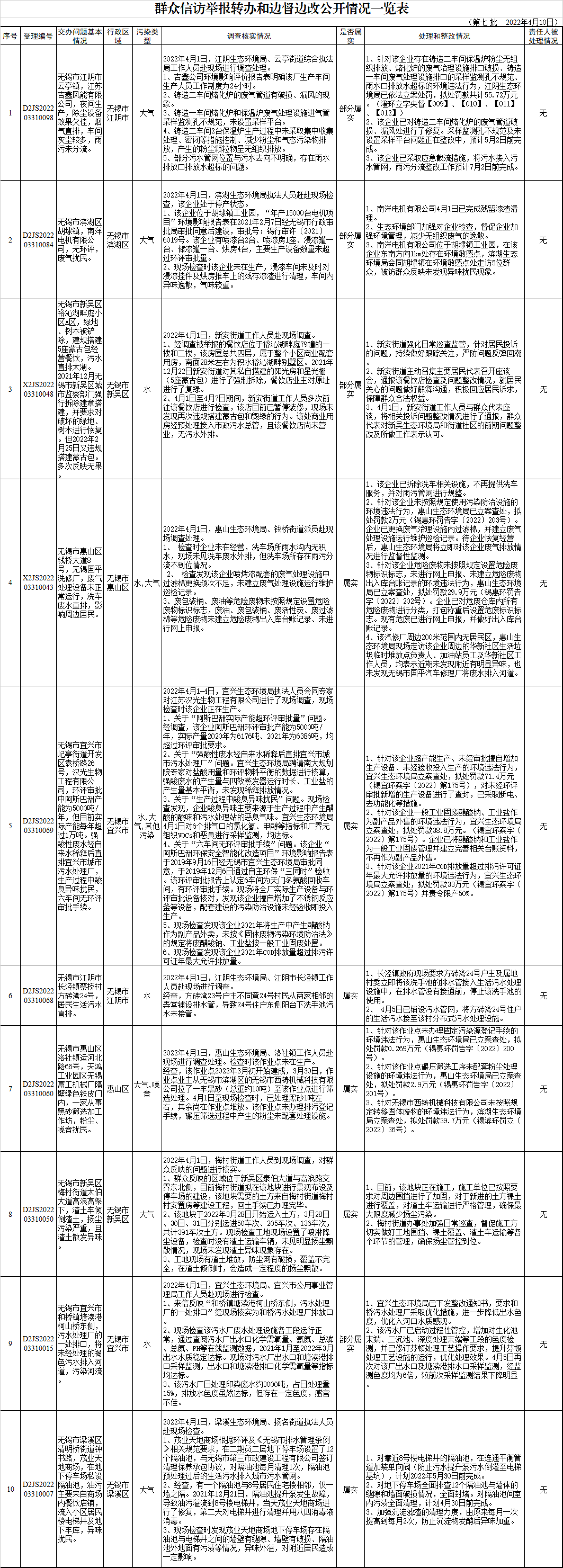 群众信访举报转办和边督边改公开情况一览表(第七批 2022年4月10日)