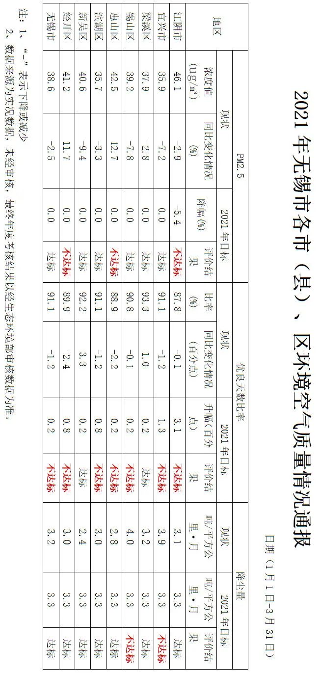 通报显示2021年1月1日—3月31日,PM2.5浓度除惠山区、经开区外均比去年同期大幅下降,除江阴市、惠山区、经开区外均达到市下达的目标任务,其中江阴市绝对值全市最高,惠山区升幅最大,滨湖区绝对值全市最低,新吴区降幅最大;优良天数比率梁溪区、新吴区达到市下达的目标任务,其中江阴市绝对值全市最低,经开区降幅最大,梁溪区绝对值全市最高,新吴区增长幅度最大。降尘量宜兴市和锡山区未达标。